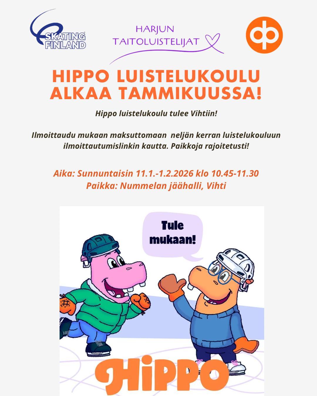Suomen taitoluisteluliiton ja OP Pohjolan tukema ilmainen HIPPO luistelukoulu tuo kaikille mahdollisuuden opetella luistelua koulutettujen ohjaajien johdolla.